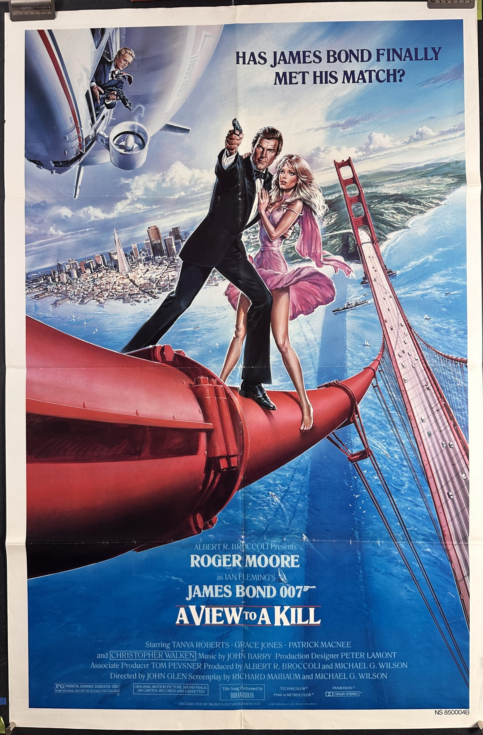 A VIEW TO A KILL, 1985. Original 1 Sheet (27 x 41” / 69 x 104 cm) folded Movie Poster starring Roger Moore, Christopher Walken, Tanya Roberts and Grace Jones. Produced by Albert Broccoli and directed by John Glen, This fourteenth installment in the Bond franchise was the seventh and the last to star Roger Moore as James Bond. In this film, 007 sets out to thwart the plans of Max Zorin (Christopher Walken) to wipe out all of California’s Silicon Valley. “Has James Bond finally met his match?”
