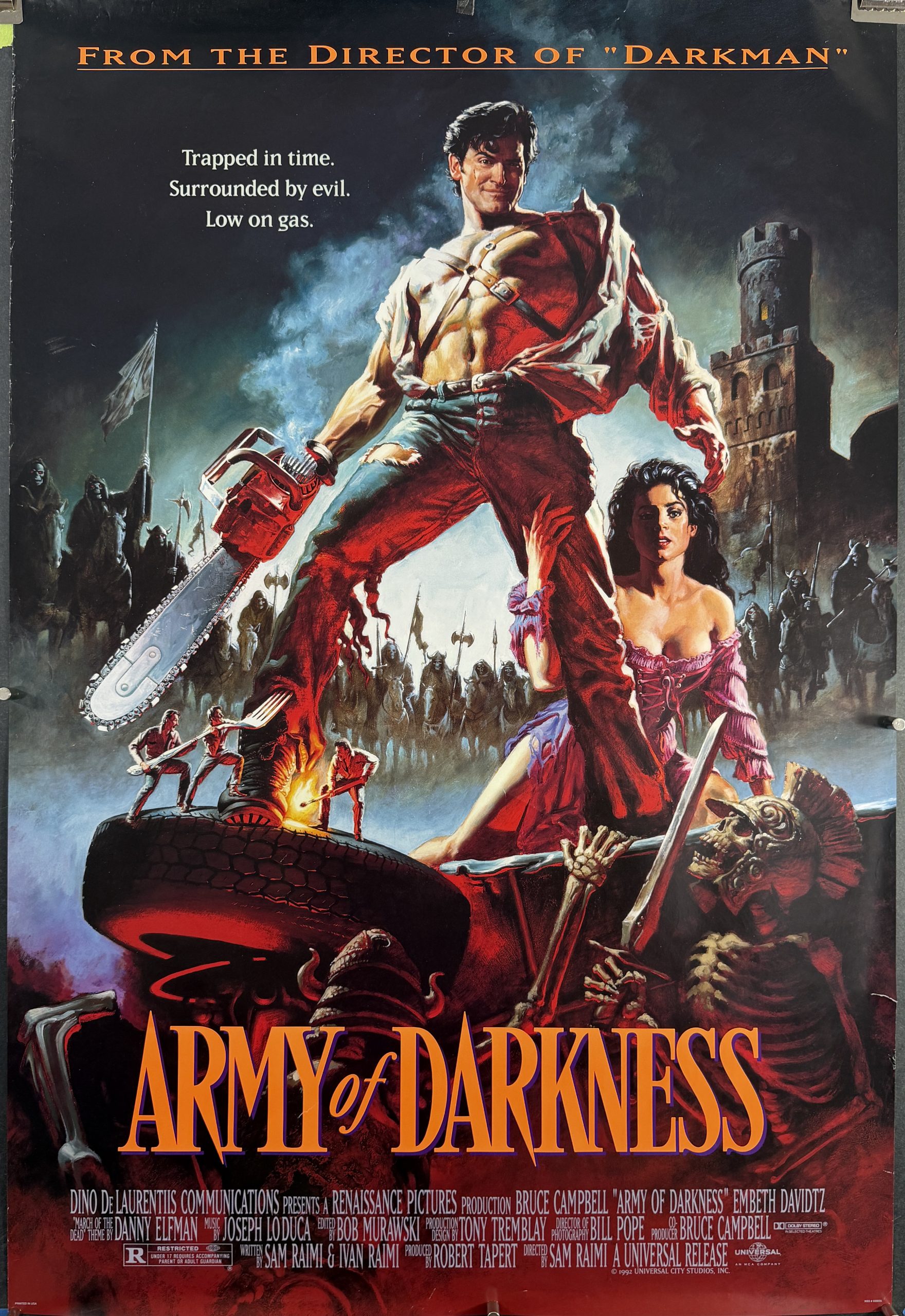 ARMY OF DARKNESS, 1992. Original 1 Sheet (27 x 40”) (89 x 131 cms) rolled, double sided Movie Poster starring Bruce Campbell, Embeth Davidtz, and Marcus Gilbert. Directed and written by Sam Raimi. “From The Director of ‘Darkman’. “Trapped in time. Surrounded by evil. Low on gas.” This is the sequel to the Evil Dead films that were true horror classics. However, Army of Darkness is more a spoof of those previous horror films. Set in the Dark Ages in the 1300s, Sorcerers, the Undead, Necronomicon and non-stop outlandish one-liners: “Yo, she-bitch! Let’s go!”, “Gimme some sugar, baby.”, and they go on and on.