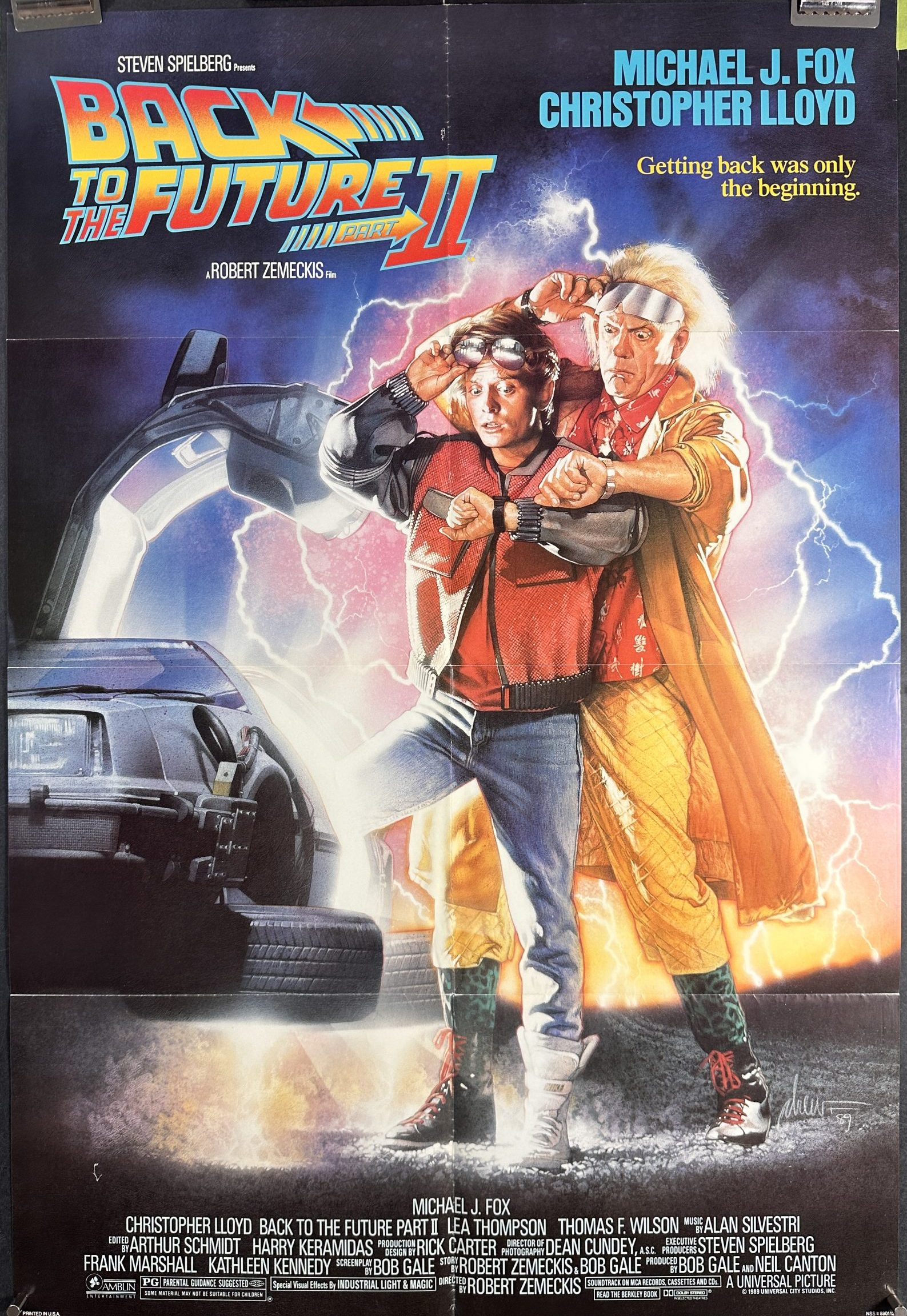 BACK TO THE FUTURE II, 1989. Original folded 1 Sheet (27 x 41” / 69 x 104 cm) Steven Spielberg Movie Poster starring Michael J. Fox, Christopher Lloyd, and Lea Thompson; written and directed by Robert Zemeckis. In this sequel we see Marty McFly and Doc Brown travel from 1985 to 5015 to stop Marty’s son from ruining their family’s future. “Getting back was only the beginning”.