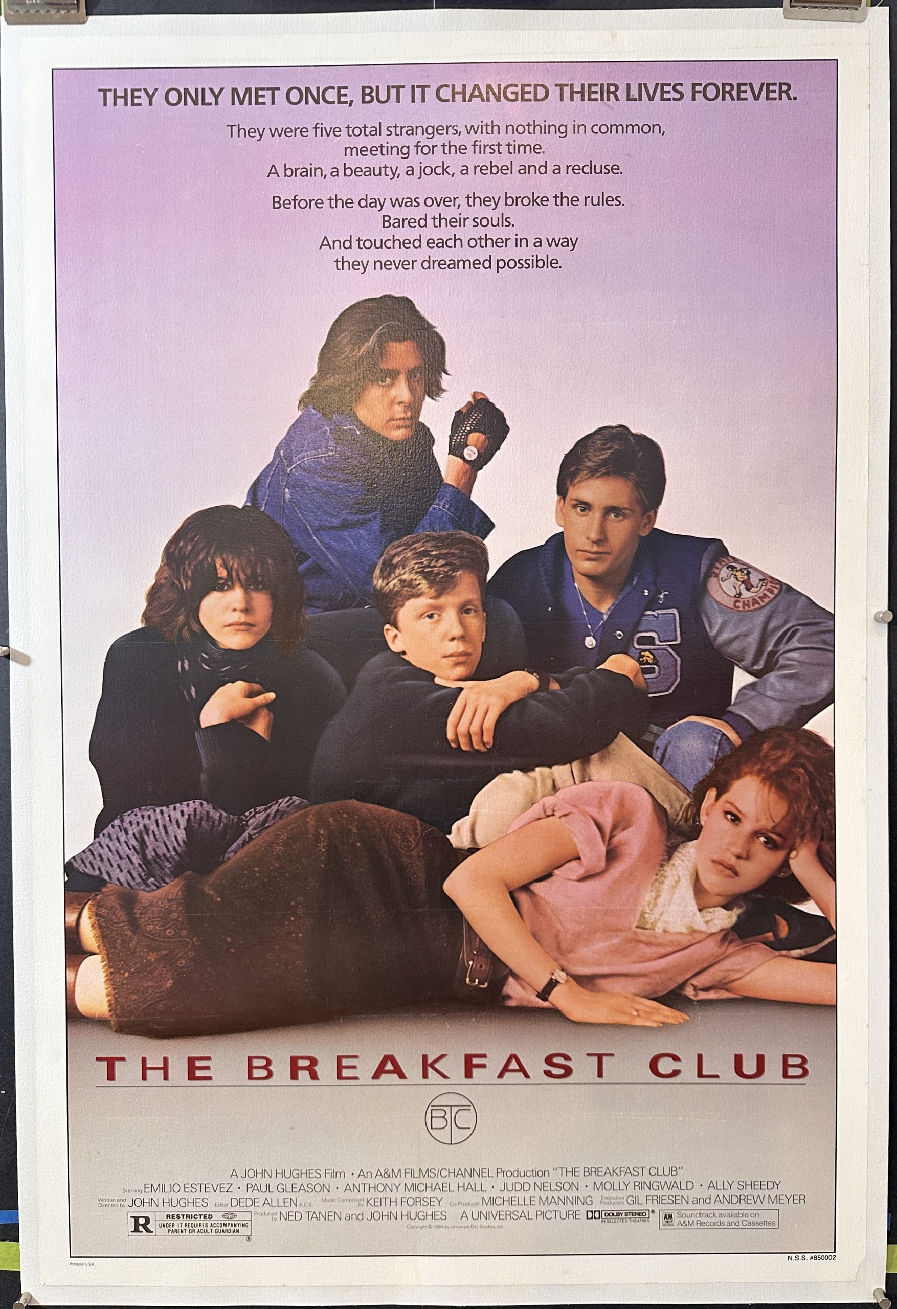 The Breakfast Club, 1985. Original One Sheet (27 x 41”), (89 x 125 cm) originally folded and now linen backed movie poster starring Emilio Estevez, Judd Nelson, and Molly Ringwald, and directed by the always hilarious John Hughes! This movie about a misfit group of teens who meet and bond in Saturday detention, starring the famous 80’s “Brat-pack”, became a cult classic for its very relatable nature and comical interpretation of classic high-school tropes! “They only met once, but it changed their lives forever.”