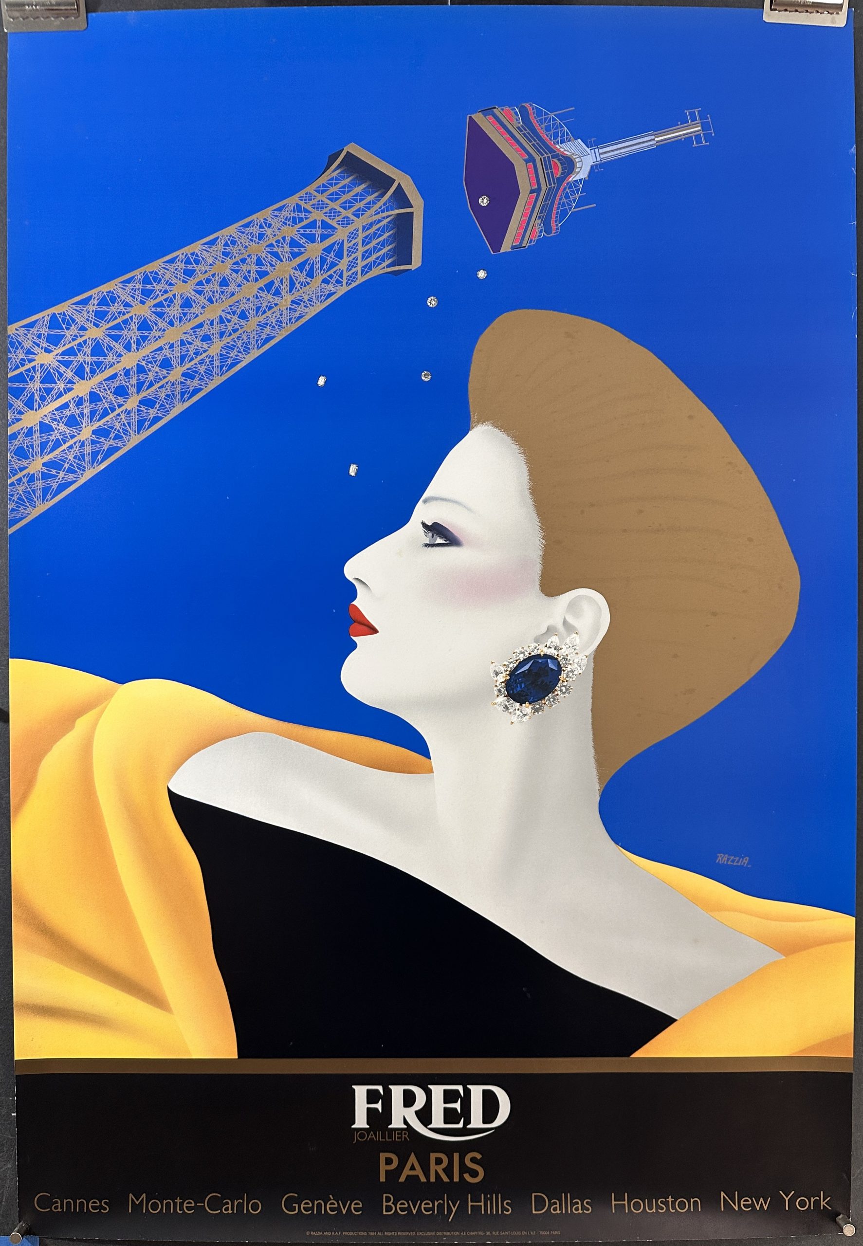 FRED JOAILLIER, 1984. Original French Advertising Poster (27 x 39” / 68.5 x 99 cm) This art-deco inspired poster was designed by artist Razzia for the jewelry brand FRED Joaillier and is considered to be a collectible item.