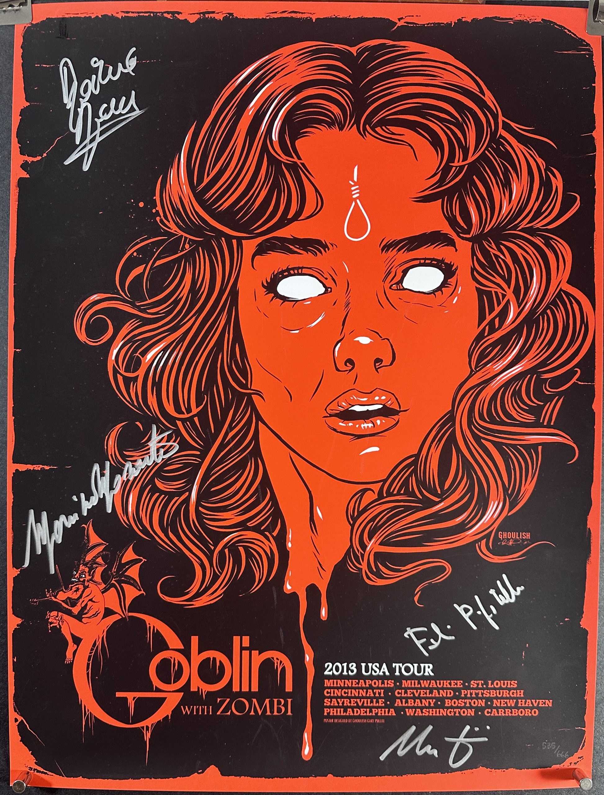GOBLIN , 2013. Original Music Poster (13 x 18” / 33 x 46 cm) for the Italian, progressive rock band Goblin, This commemorative poster promoted their 2013 USA Concert Tour with the band Zombi and features the head of a ghoulish, red, eye less woman. The poster lists the towns for their tour and is signed by members of the band.