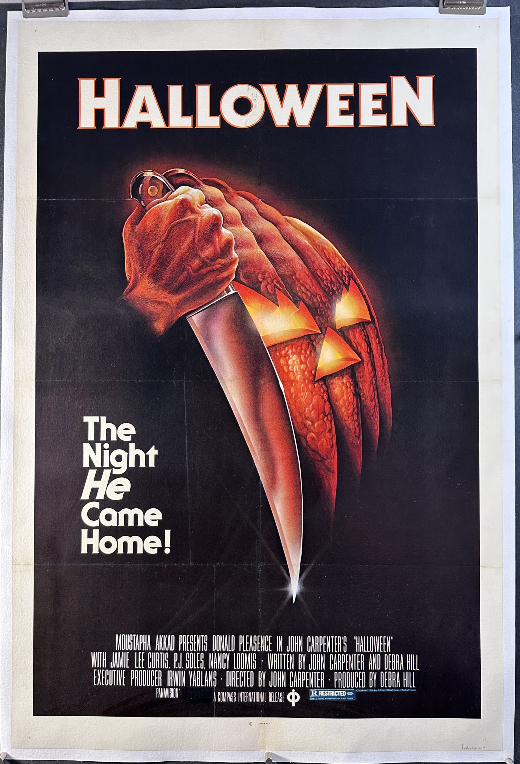 HALLOWEEN, 1978. Original One Sheet (27 x 41”), (89 x 125 cm) originally folded and now linen backed movie poster starring Jamie Lee Curtis, Donald Pleasence, Nancy Kyes and directed by John Carpenter who was also the author. This is widely considered to be the first film to start a popular resurgence of the horror genre and really set the standard for the next two decades. Well acted but with a small budget this was also the breakout role for Jamie Lee Curtis.  “The night He came home”. There are variants of this poster with different colored ratings boxes, namely black or green or to some eyes blue-green. This poster has the blue-green ratings box which represents the earlier print run of this poster. As supplies ran out the additional posters were printed with the black ratings box.