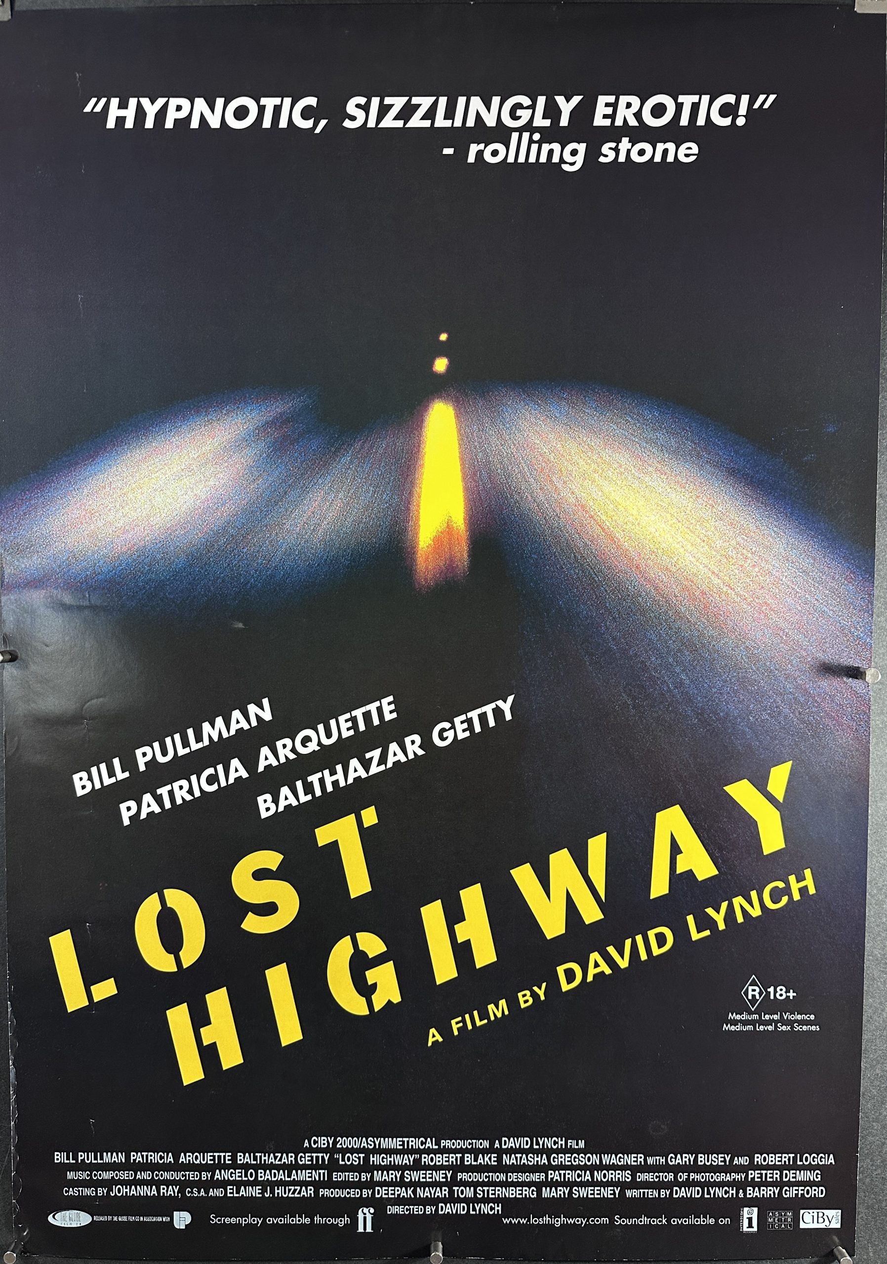 LOST HIGHWAY, 1997. Original rolled 1 Sheet (27 x 40” / 89 x 131 cm) Movie Poster starring Bill Pullman and Patricia Arquette and directed by David Lynch. In typical David Lynch fashion, this thriller crosses the line between mystery and surrealism. “Hypnotic, Sizzling, Erotic!”