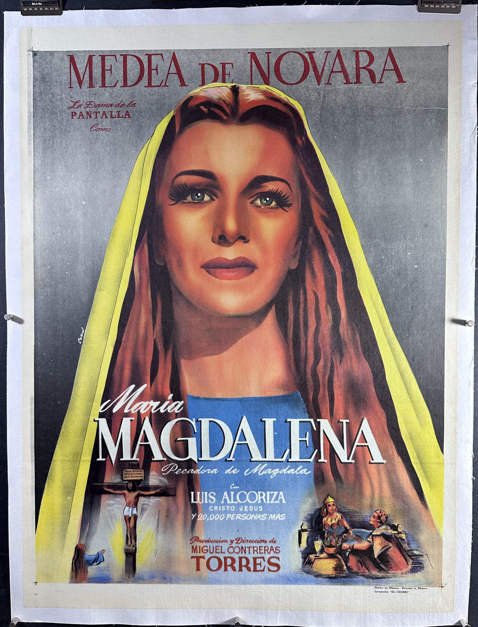 MARIA MAGDALENA, 1949. Original Linen Backed Mexican (27 x 37” / 69 x 94 cm) Movie Poster starring Medea de Novara and Luis Alcoriza and directed by Miguel Contreras Torres. This Mexican Historical Drama depicts the life of Mary Magdalene, a biblical figure traditionally associated with repentance and devotion to Jesus Christ. The movie was part of a wave of religious-themed Mexican cinema during the mid-20th century, reflecting the country’s deep-rooted Catholic traditions.