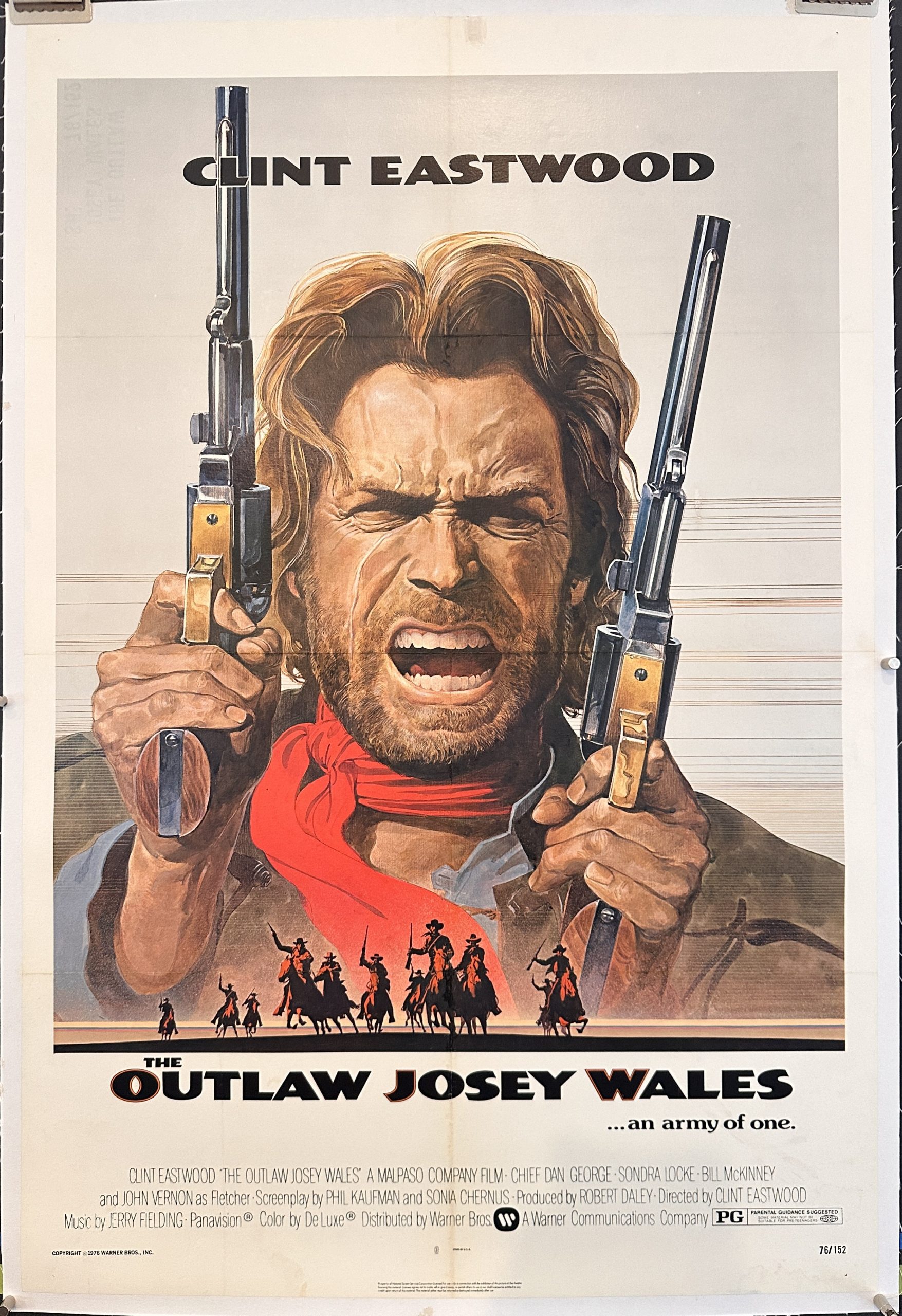 OUTLAW JOSEY WALES, 1976. Original Insert (14 x 36”) folded Movie Poster starring and directed by Clint Eastwood. Josey Wales is a confederate farmer from Missouri who makes his way west after his family’s slaughter during the Civil War. While on his journey to the west, he joins with a group of settlers who need protection from a tough and experienced man like Josey. Unfortunately, his past eventually catches up with him since he is a wanted man. “The Outlaw Josey Wales…an army of one.”