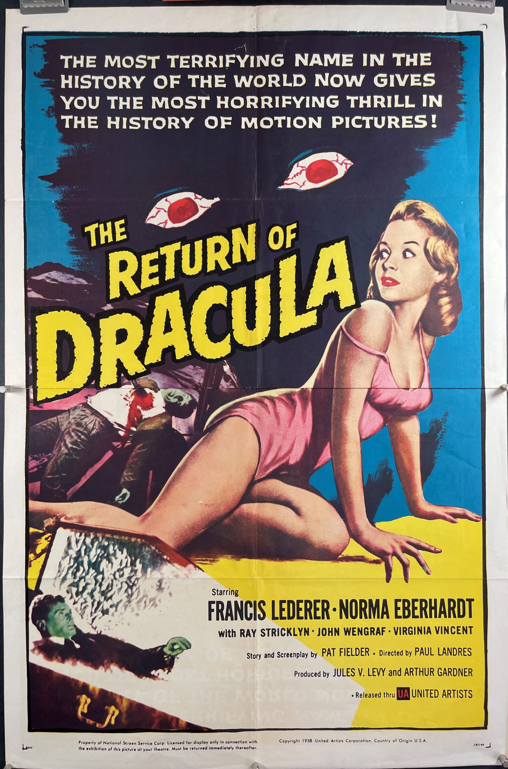 RETURN OF DRACULA, 1958. Original folded 1 Sheet (27 x 41” / 69 x 104 cm) Movie Poster starring Francis Lederer and Norma Eberhardt and directed by Paul Landres. We see gothic horror icon Dracula on the run until he’s met with an opportunity to murder an artist and assume his identity. This film was made during a period when vampire movies were gaining great popularity. “The most terrifying name in the history of the world now gives you the most horrifying thrill in the history of motion pictures!”