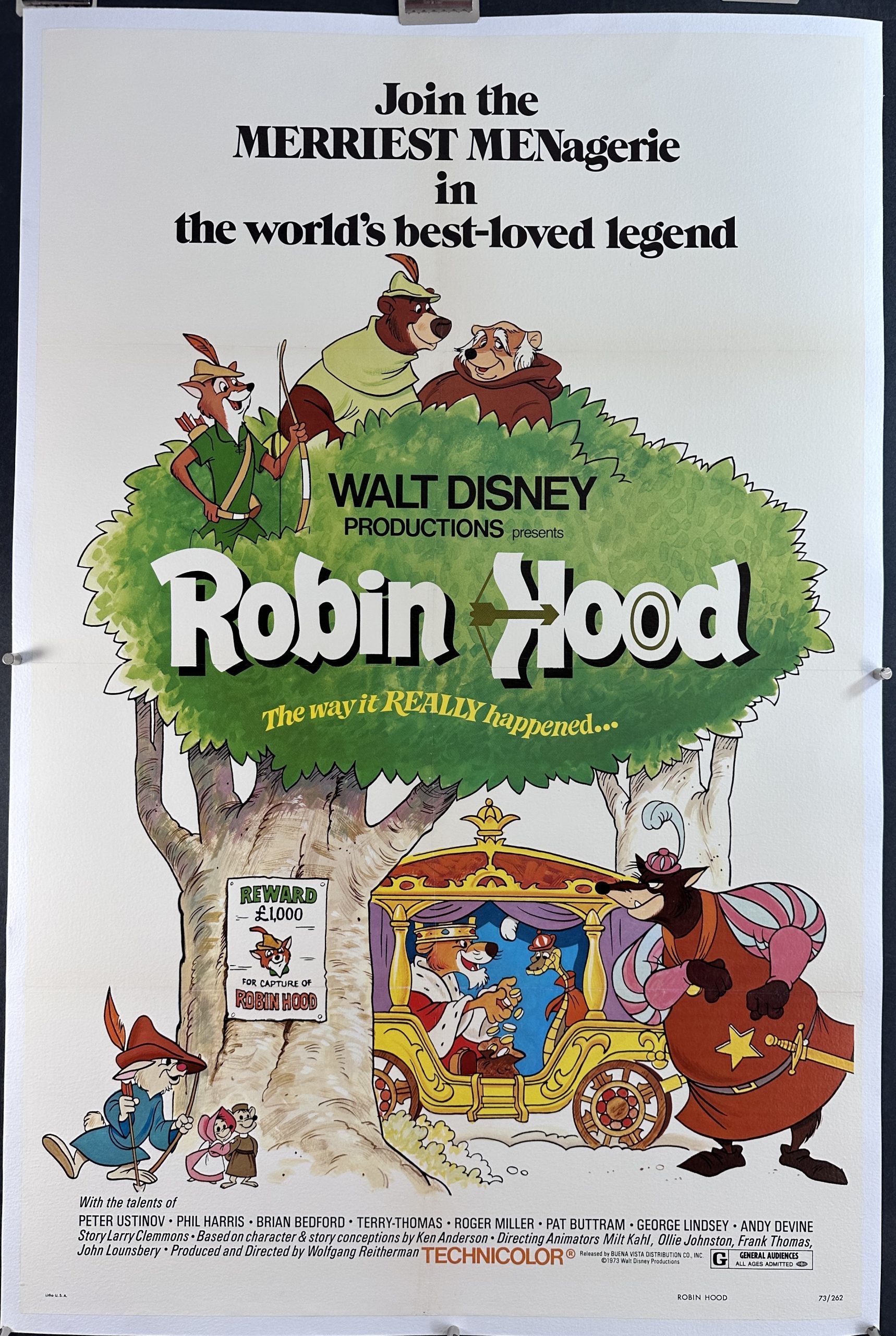 ROBIN HOOD, 1973. Original One Sheet (27 x 41”), (89 x 125 cm) originally rolled and now linen backed Walt Disney movie poster starring the voices of Peter Ustinov, Terry Thomas, Monica Evans and Andy Devine, and directed by Wolfgang Reitherman for Walt Disney studios. This much beloved tale written by Howard Pyle in 1883 and brought to life many times by Hollywood was retold again in 1973 as an animated cartoon with animals taking over the human roles. “Join the Merriest MENagerie in the World’s best-loved legend”. “The way it really happened…”