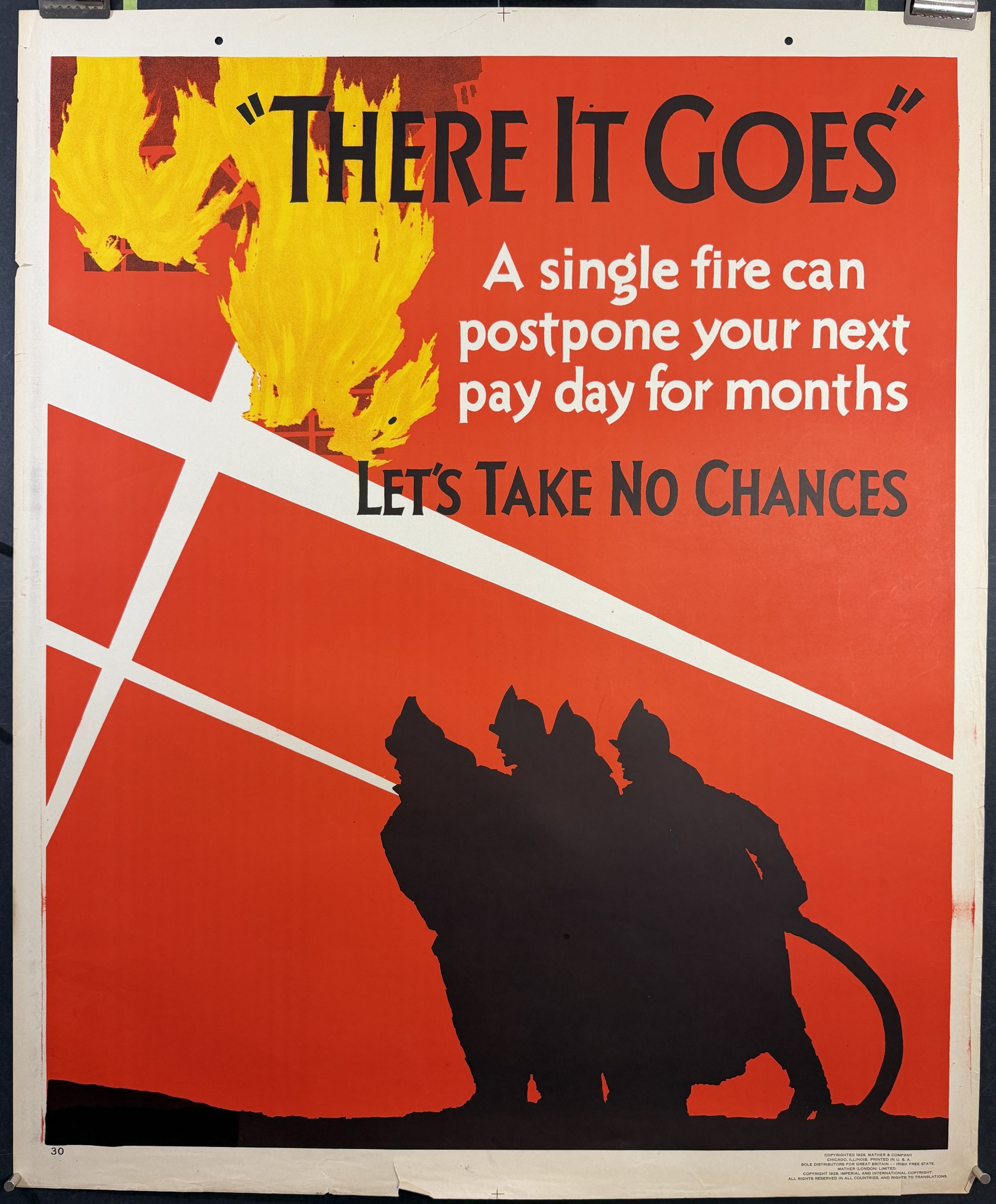 A RARE Original 1920s Mather Motivational Poster. These posters were issued and distributed by subscription between 1923 and 1929. Approximately 350 different color lithographs were designed by various artists throughout these years and promoted good, safe workplace habits prior to the great depression. “A single fire can postpone your next pay day by months. LetTake no chances”