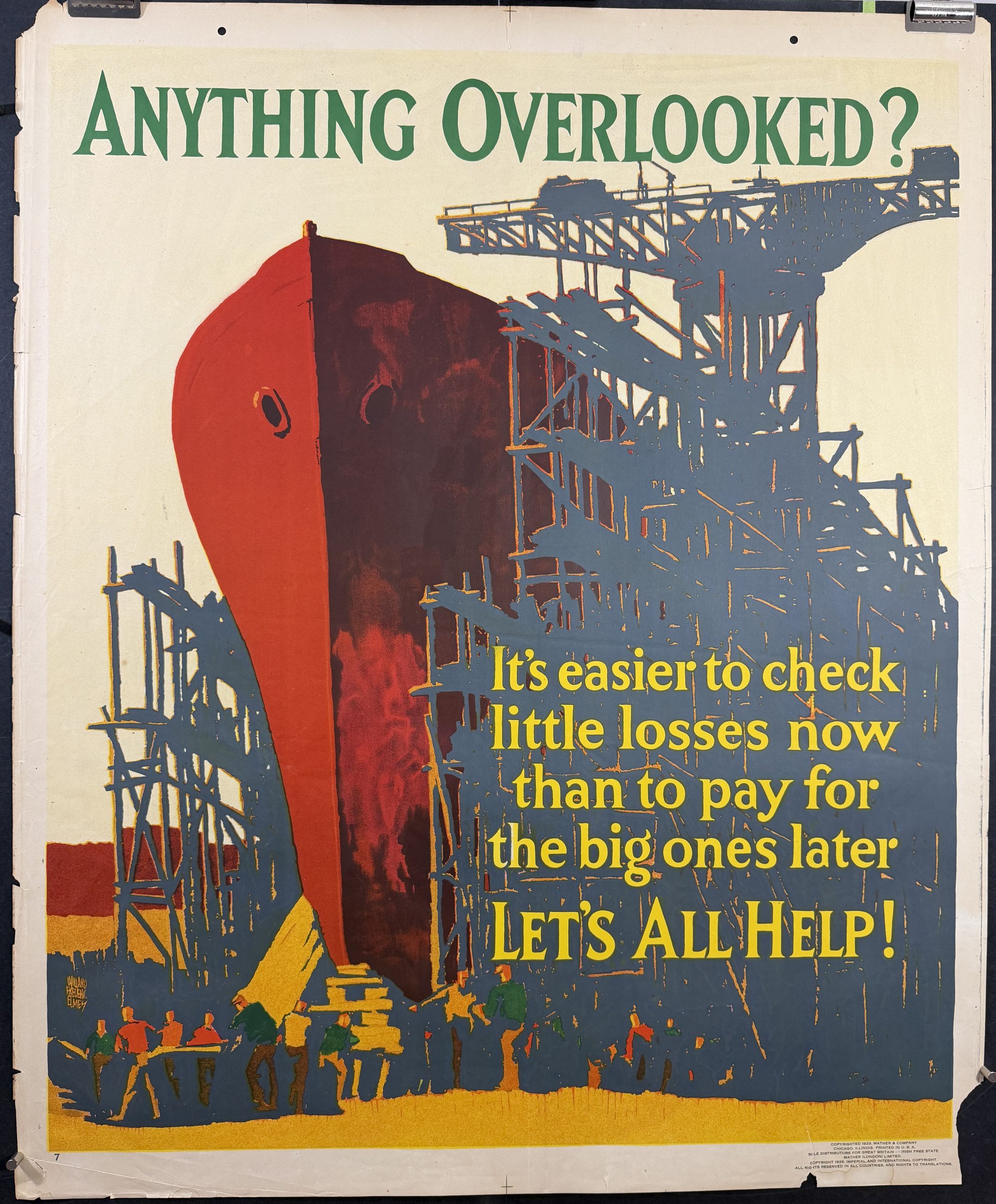 A RARE Original 1920s Mather Motivational Poster. These posters were issued and distributed by subscription between 1923 and 1929. Approximately 350 different color lithographs were designed by various artists throughout these years and promoted good, safe workplace habits prior to the great depression. “It’s easier to check little losses now than to pay for the big ones later – Let’s All Help”