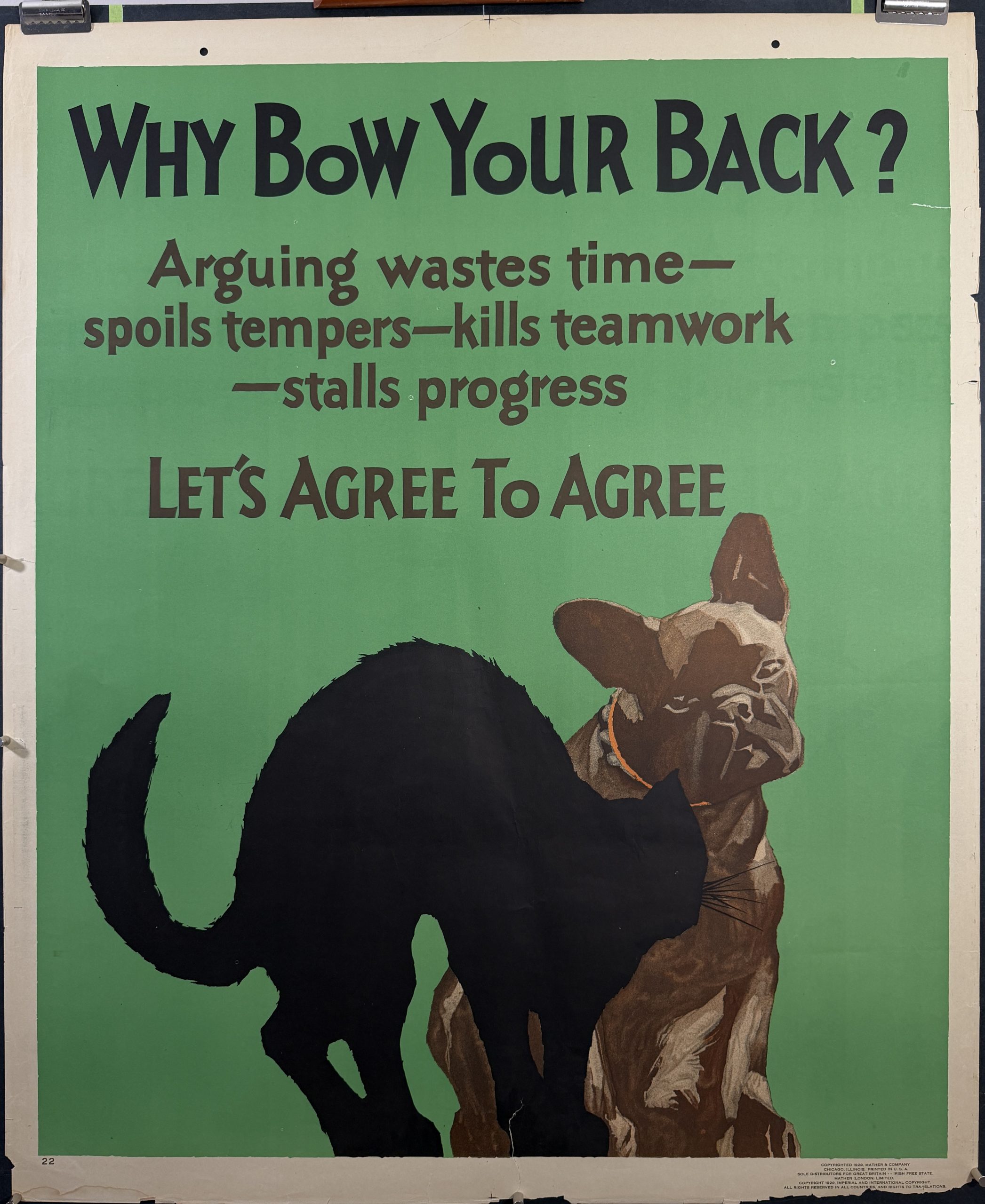 A RARE Original 1920s Mather Motivational Poster. These posters were issued and distributed by subscription between 1923 and 1929. Approximately 350 different color lithographs were designed by various artists throughout these years and promoted good, safe workplace habits prior to the great depression. “Arguing wastes time – spoils tempers – kills teamwork – stalls progress. Let’s agree to agree”.
