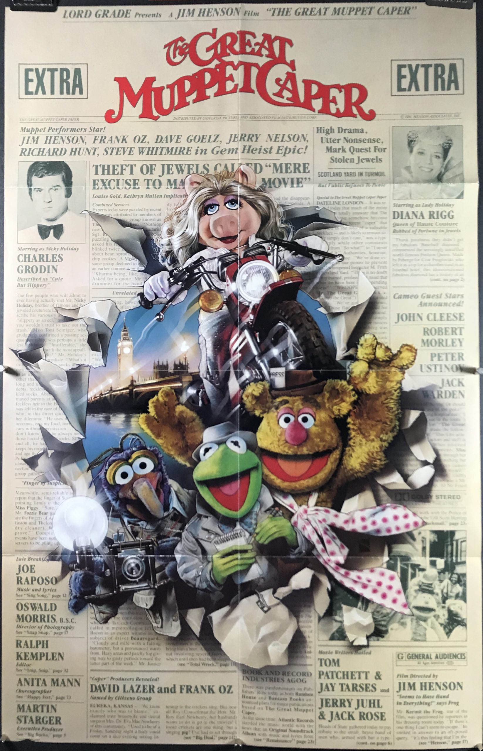 GREAT MUPPET CAPER, 1981. Original folded 1 Sheet (27 x 41” / 89 x 104 cm) Movie Poster starring the Muppets voiced by Jim Henson, Frank Oz and Dave Goelz and directed by Jim Henson. Kermit the Frog and Fozzie Bear are reporters on assignment in London to report on a jewel theft.