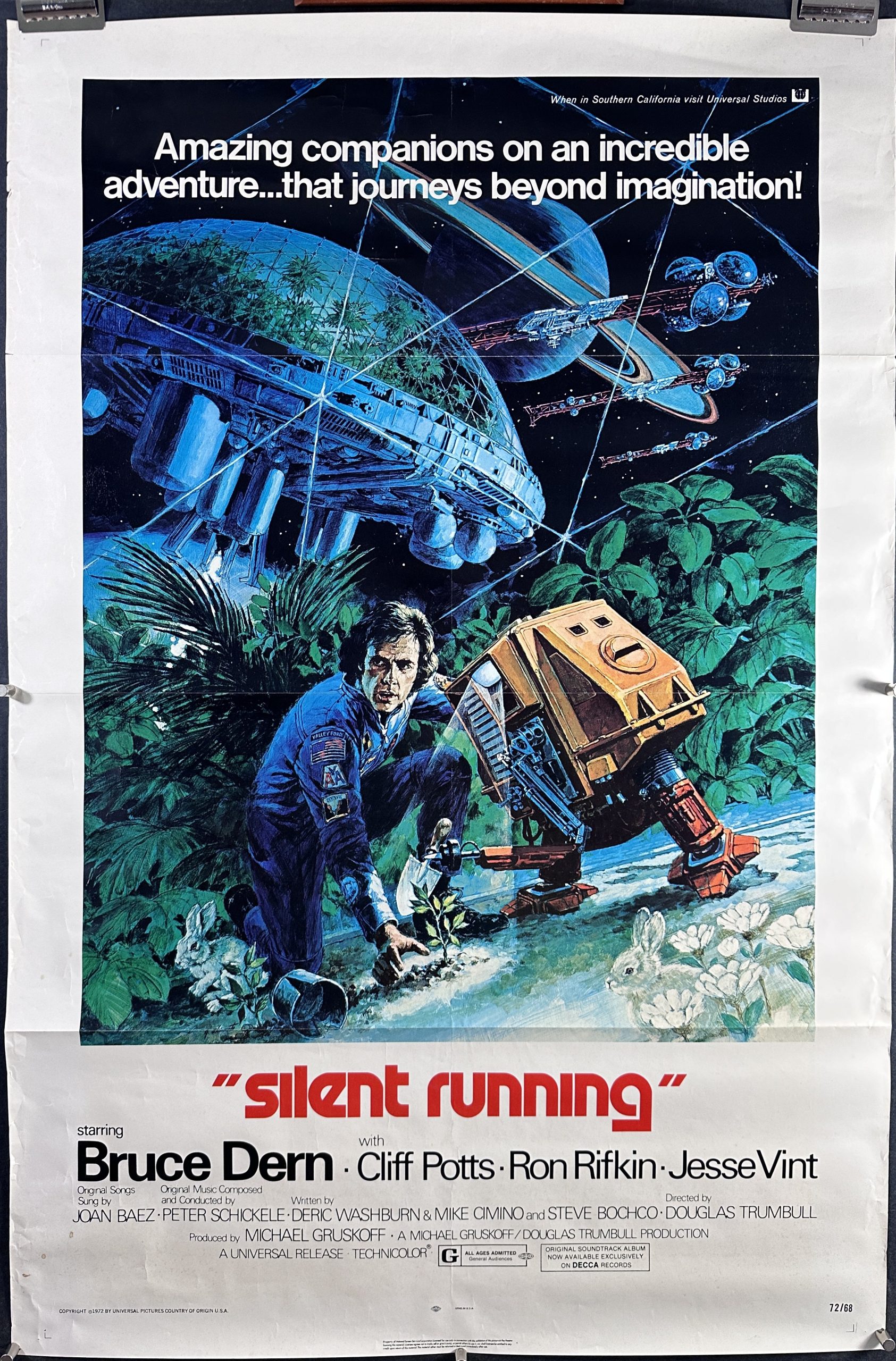 SILENT RUNNING, 1972. Original folded 1 Sheet (27 x 41” / 69 x 104 cm)  Movie Poster starring Bruce Dern, Cliff Potts, Ron Rifkin, and Jesse Vint; Directed by Douglas Trumbull. This movie explores a future time where all flora is extinct on Earth and is now kept in a greenhouse located aboard a spacecraft in orbit. When the greenhouses are ordered to be destroyed, the main astronaut/caretaker of the greenhouse ignores the order to save the beloved forest and its creatures as they are “preserving the ecology of the universe”. He kills his three colleagues, steals the ship and takes off into deep space with his three small robots as companions. “Amazing companions on an incredible adventure…that journeys beyond imagination!”