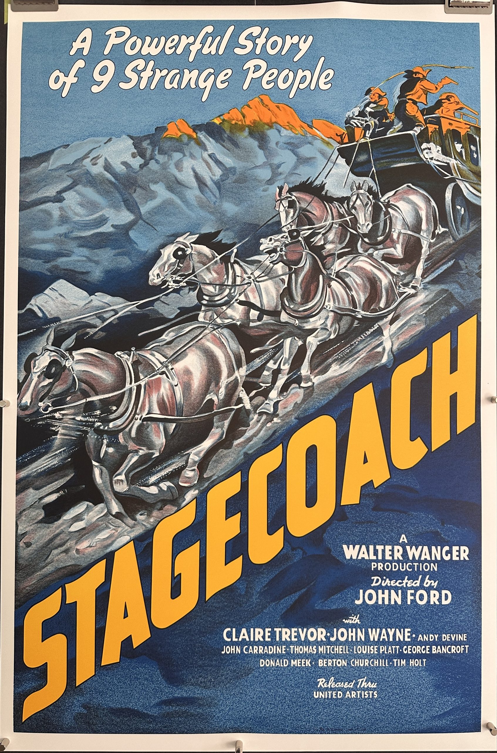 STAGECOACH, 1939. Original Rolled 1 Sheet (27 x 41” / 69 x 104 cm) Movie Poster starring John Wayne, Claire Trevor and directed by John Ford. A stagecoach trip consisting of an odd bunch of personalities is faced with the reality of their personal conflicts, prejudice toward one another, and the threat of an attack from Geronimo and his people. “A powerful story of 9 strange people”.