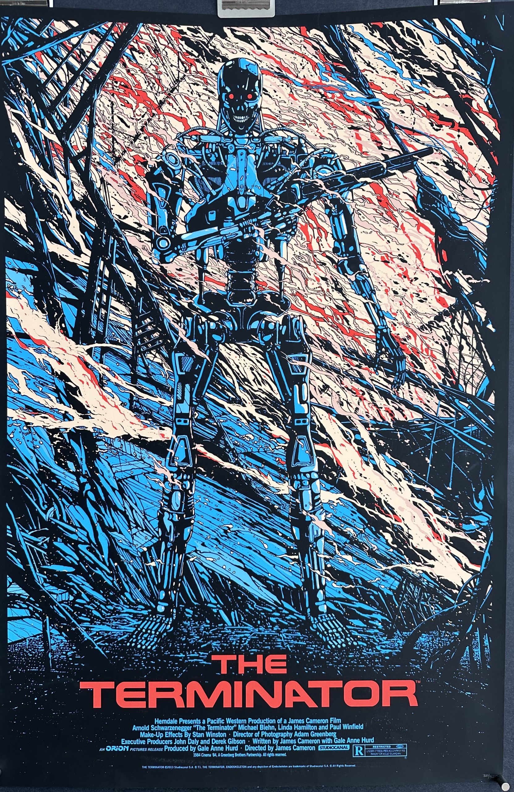TERMINATOR, 1984. Original rolled 1 Sheet (24 x 36” / 60 x 90.5 cm) Movie Poster starring Arnold Schwarzenegger, Michael Biehn and Linda Hamilton. Directed by James Cameron this classic and much loved action, sci-fi movie kicked off the franchise and brings Schwarzenegger back in time from 2029 to 1984 to kill Sarah Connor, played by Linda Hamilton. Linda’s unborn son is the threat to the future of the cyborg world. This specific poster style is highly collectible and was designed by Mondo, an American Screen-printing company founded by the Alamo Drafthouse Cinema.