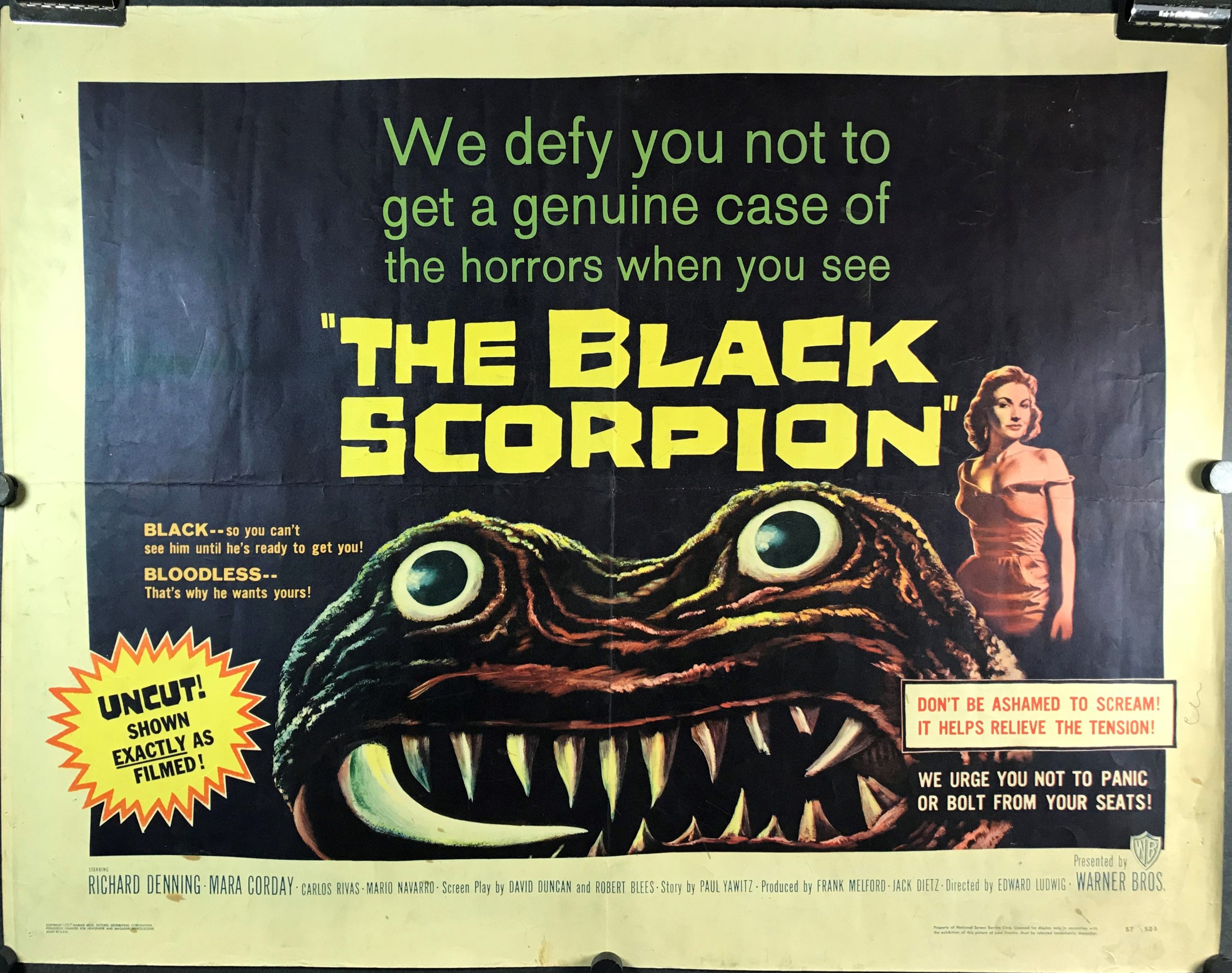 BLACK SCORPION, 1957. Original Half Sheet (22” x 28” / 72 x 92 cm) starring Richard Denning and Mara Corday with direction by Edward Ludwig. Giant scorpions released through a volcanic eruption devour and kill everything in their sight. Yes for once radiation is not the culprit! “We defy you not to get a genuine case of the horrors when you see The Black Scorpion”.