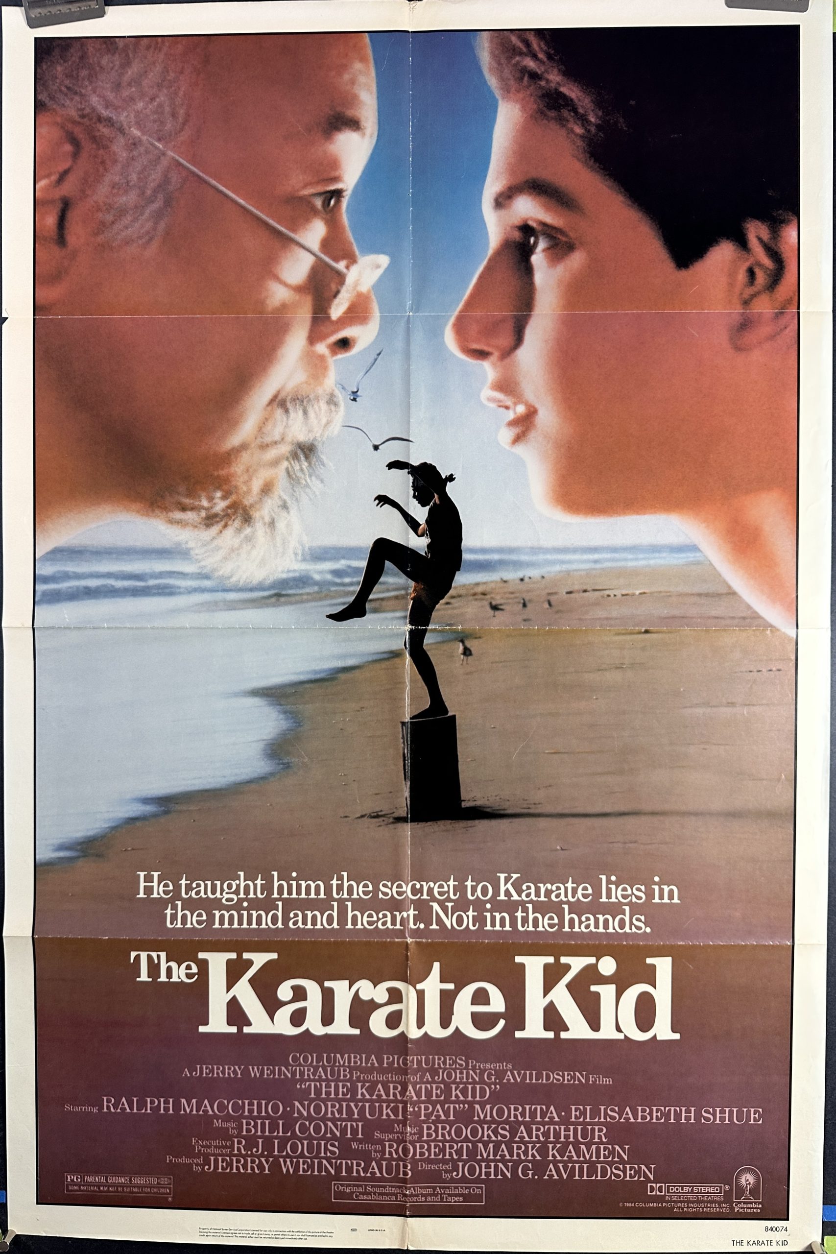 KARATE KID, 1984. Original folded 1 Sheet (27 x 41” / 69 x 104 cm) Movie Poster starring Ralph Macchio and Pat Morita as Miyagi; Directed by John G. Avildsen. This classic film follows a bullied teenage boy, Daniel, and his journey in learning karate from Miyagi. At the beginning of the training, Daniel doesn’t understand what Miyagi is teaching him – especially since Miyagi seems more interested in instructing Daniel to wax cars and pain fences rather than Karate directly. “He taught him the secret to Karate lies in the mind and heart. Not in the hands”