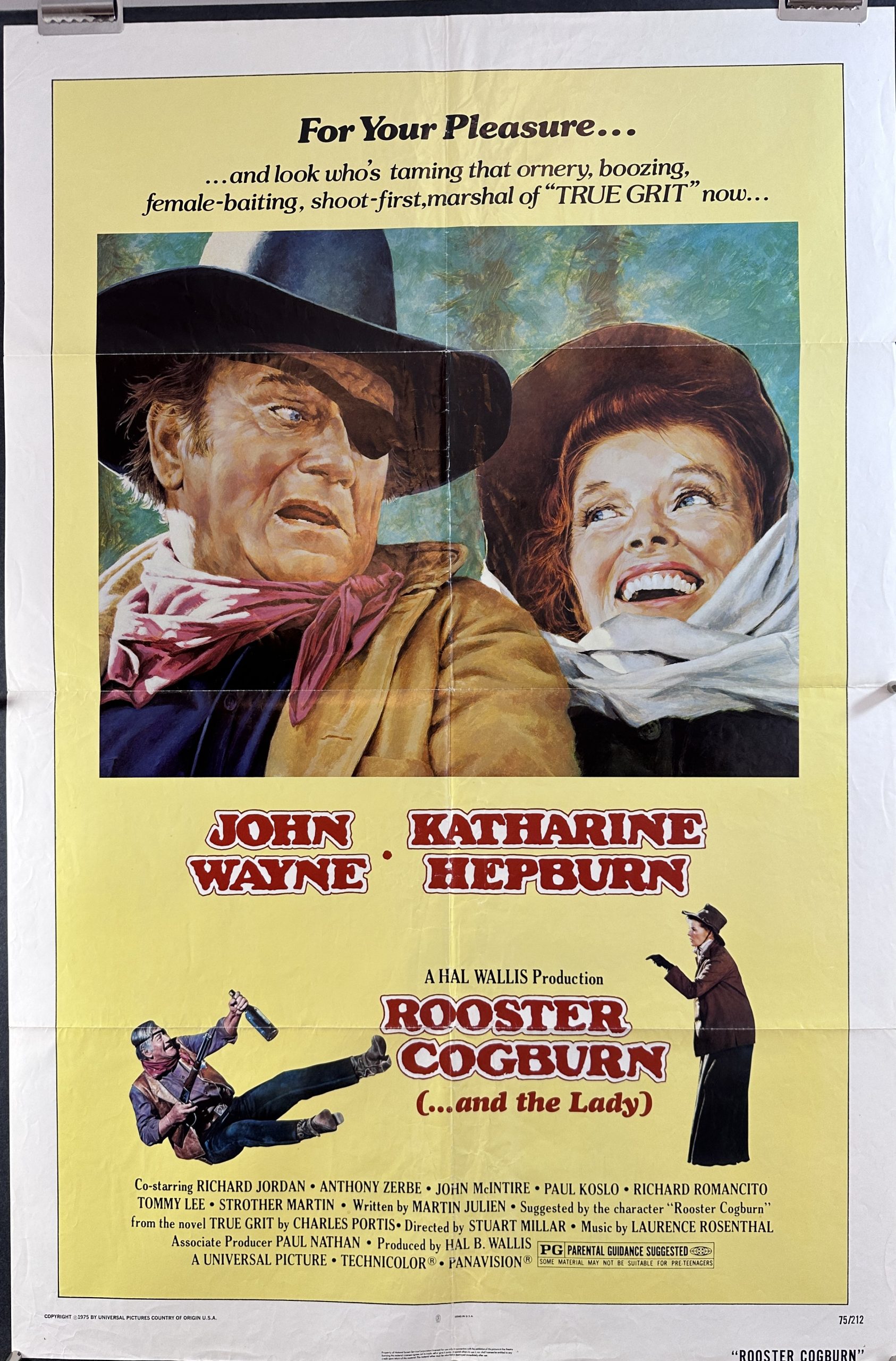 ROOSTER COGBURN, 1975. Original folded 1 Sheet (27 x 41” / 69 x 104 cm) Movie Poster starring John Wayne and Katharine Hepburn and directed by Stuart Millar. This film is the sequel to True Grit, an unplanned pairing between Marshal “Rooster Cogburn (…and the lady)” who team up to track down her father’s murderers. “For your pleasure…and look who’s taming that ornery, boozing, female-baiting, shoot-first, marshal of “TRUE GRIT” now…”