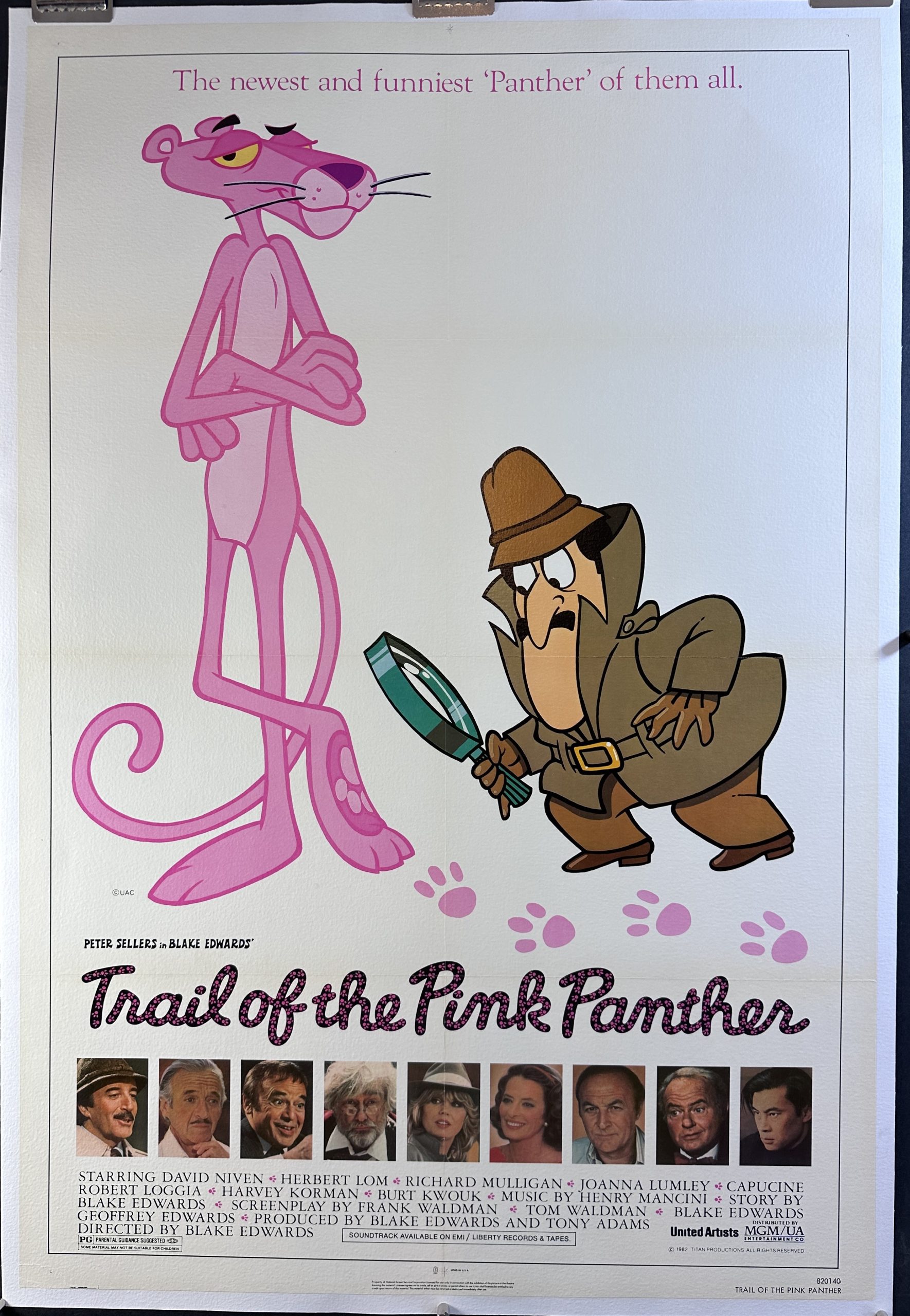 TRAIL OF THE PINK PANTHER, 1982. Original One Sheet (27 x 41”), (89 x 125 cm) originally folded and now linen backed movie poster starring Peter Sellers, David Niven and Joanna Lumley. Produced and directed by Blake Edwards. “The newest and funniest ‘Panther’ of them all”. The last of the Panther series to star Sellers, even though, he died before it was made!