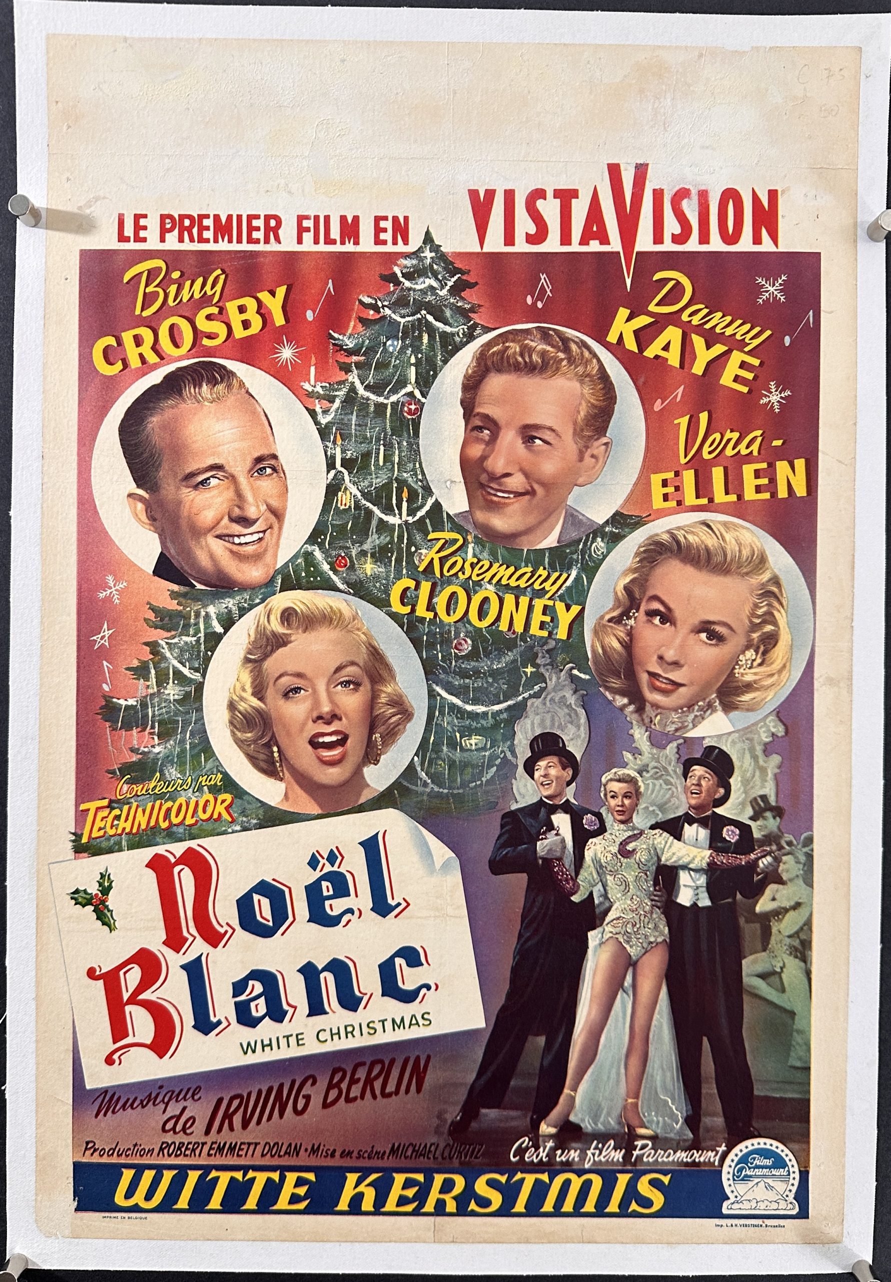 WHITE CHRISTMAS, 1954. Original Belgian (14 x 21” / 46 x 69 cm) Linen Backed Movie Poster starring Bing Crosby, Danny Kaye, Rosemary Clooney, and Vera Ellen; Directed by Michael Curtiz; music and lyrics by Irving Berlin. This Christmas classic stars Bing Crosby as Bob Wallace and Danny Kaye as Phil Davis – two friends from the Army who team up to become a song-and-dance act after WWII. The duo travel to a lodge in Vermont with a pair of two beautiful sisters who also have a song-and-dance act, but quickly realize the lodge belongs to their former commander, General Waverly. Every once in a while Hollywood gets it right: this is one of those movies a must see for all families at Christmas!