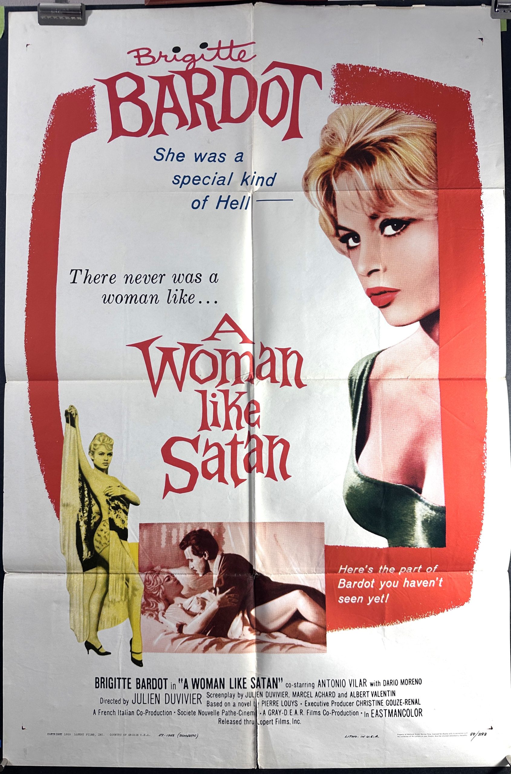 WOMAN LIKE SATAN, 1959. Original folded 1 Sheet (27 x 41” / 69 x 104 cm) Movie Poster starring Brigitte Bardot and Antonio Vilar and directed by Julien Duvivier. This film was also released under the name “The Female” and is the fourth film adaptation of the 1898 novel The Woman and the Puppet by Pierre Louÿs. “She was a special king of Hell—-”